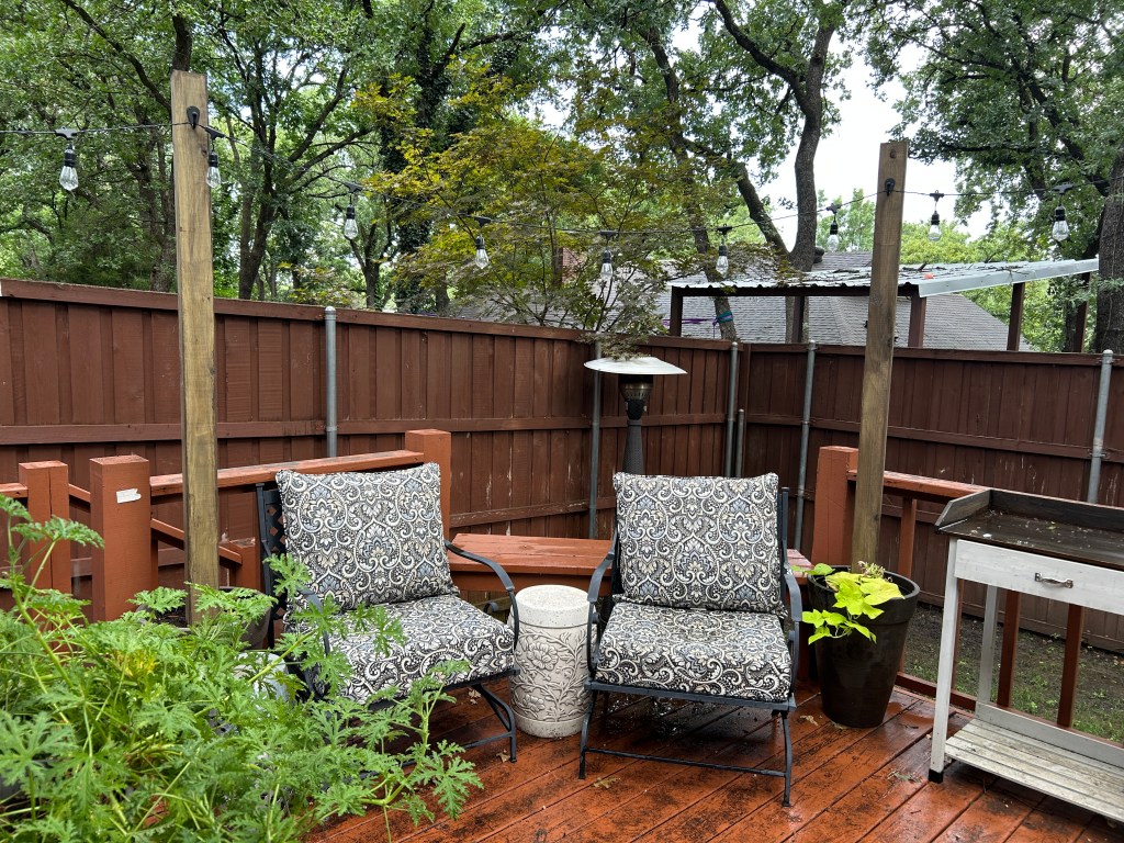 Now, do I wish I had some before pics to show the glow-up? Of course. But here we are—living in the “after” with twinkle lights overhead and flowers blooming in planters my girls helped me build. (Yes, tears were shed. No, I will not apologize.)
