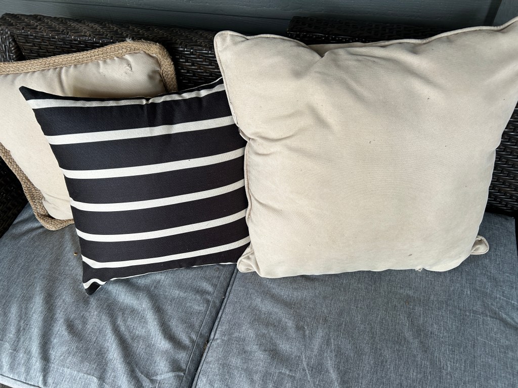Now let’s talk patio furniture. I bought our set years ago from Pier 1 (RIP). Since then, finding cushions that actually fit has been a nightmare. Also, Texas squirrels apparently have a personal vendetta against my patio pillows.