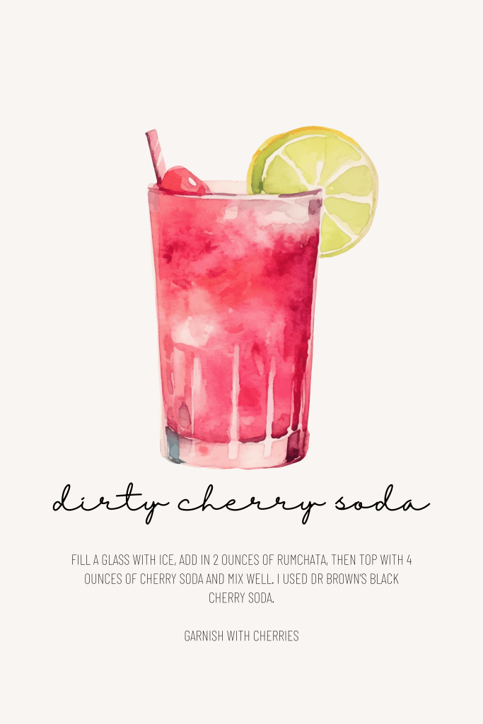…basically, anything fizzy in the fridge was fair game. Highly recommend Pinteresting it or just pouring a shot of RumChata into whatever you’re drinking and seeing what happens. It’s a vibe. And who does not like a drink with the title “Dirty”?