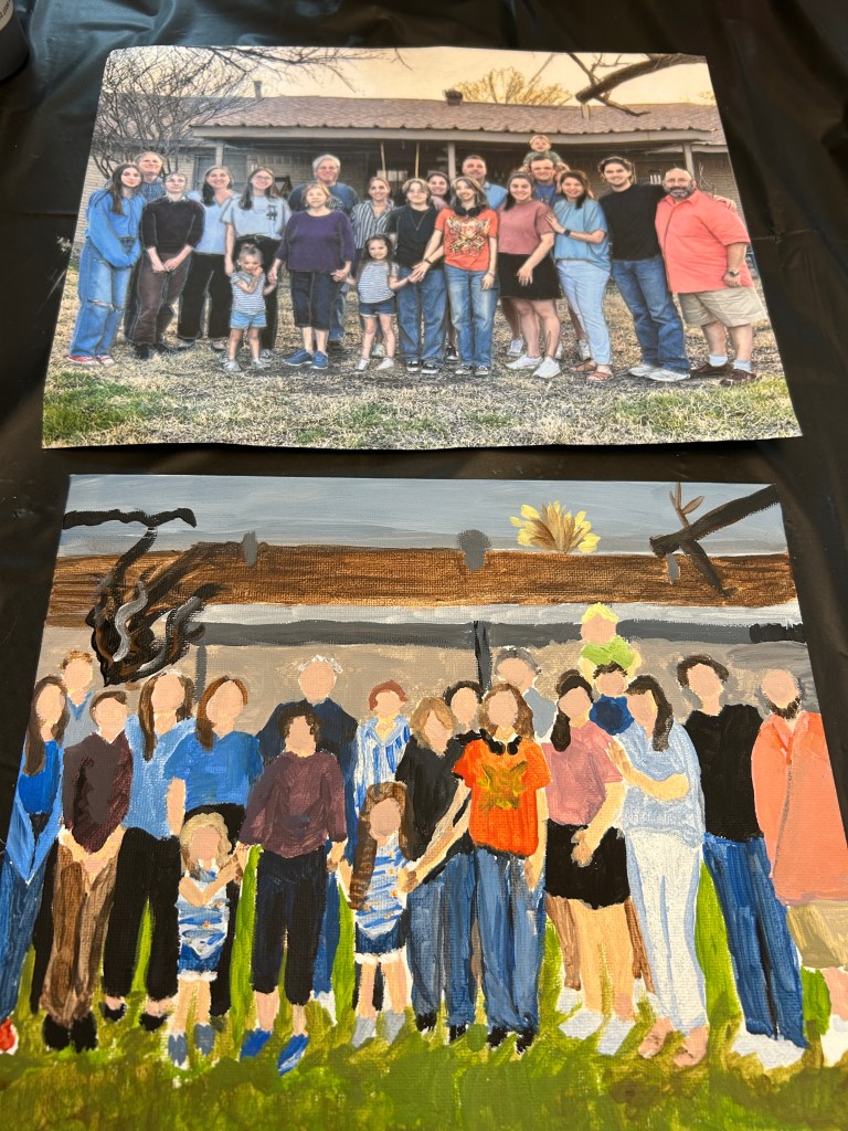 While they traded canvases, I tried a new trick I found while doomscrolling Instagram at midnight (because obviously). The hack? Print a photo, rub pencil on the back, trace it on a canvas, and boom — paint-by-number magic. I chose a recent family pic from a rare moment when all 20 of us made it to dinner at my mom’s. No faces needed — I could still tell exactly who was who.